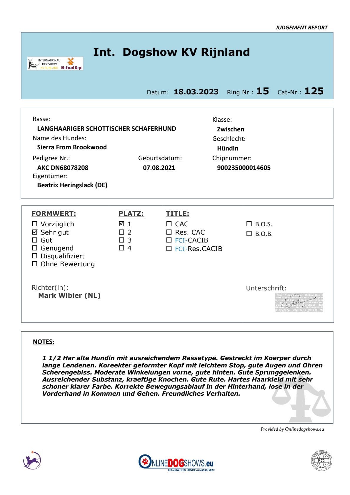 Int. Dogshow KV Rijnland März 2023: SG 1. Platz